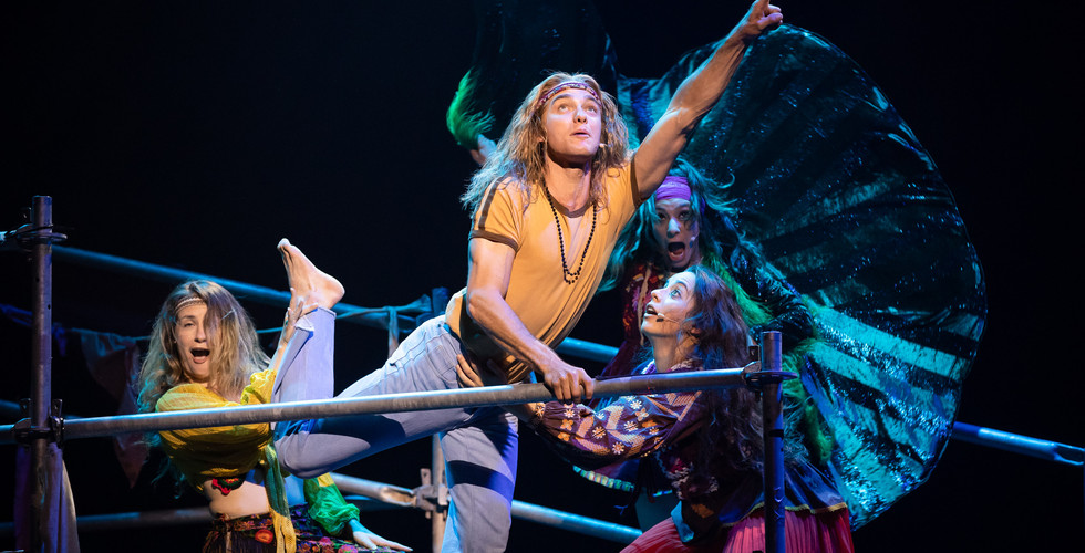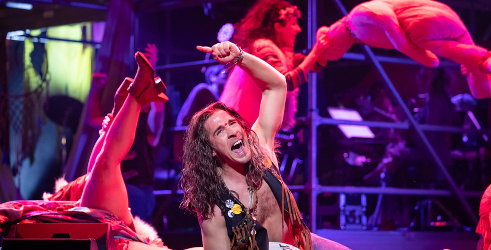 Immersing us in the world of the 1967 counterculture movement immediately, the Concert Hall of the Sydney Opera House is now home to scaffolding adorned with colourful fabrics and a haze that will only get thicker. The characters are already moving through the space, hugging and dancing freely, completely oblivious to our presence. But that won’t last long. This is a show peppered with maniacal fourth wall breaks. Their costumes are fringed, brightly patterned and wild- they create a seamless microcosm of the hippie scene, and from the second you enter you are intrigued.