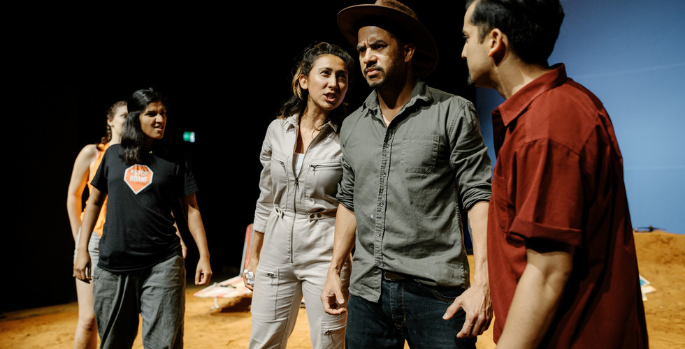 The play starts with a story telling, this is achieved by using a backlit screen and the shadow of Lasseter, great use is made of the beaten Akubra for silhouette action! Lasseter tells the story of his original adventure into the centre of Australia, where he supposedly found an incredible gold reef, then was rescued by Afghan cameleers. Lasseter is played by Tamara Bailey who has a beautiful voice and ably conveys the charismatic and charming Lasseter, someone who was able to sell the dream of gold and 30 years later convince investors to commit a huge amount of money to launch an expedition into the red centre. The rest of the cast are an antithesis of the characters they are playing, non-white, non-male, as the writer Kim Ho plays with the comparison of Australia’s National Identity then and now. The other 4 cast members, Sermsah Bin Saad, Jessa Koncic, Karl Richmond, Sandra Umbagai-Clarke are modern characters who mingle throughout the play with the character of Lasseter.