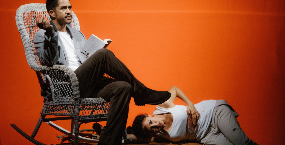 The set design by Carmody Nicol consists of 2 whiteboards, a mound of sand and a deckchair, it nevertheless manages to convey the endless landscape and heat, this is reinforced by the excellent lighting design by Nick Molony.