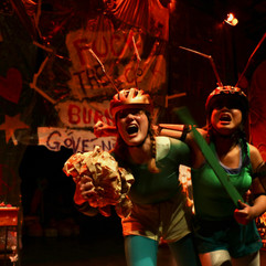 The play divides into two narratives: in one, the three young anarchists argue over how to take over the world and create Utopia before it’s all too late. Hayley Edwards is hilarious as Moon, a kind-hearted shoplifting enthusiast whose vacant perkiness vividly recalls Amanda Seyfried in Mean Girls. As Pepper and Kitty, Vivian Nguyen and Alana Louise keep up a continuous witty, bickering repartee. Director Amelia Burke interweaves a series of darkly adorable vignettes throughout this, following the lives of various creatures trying to survive in what’s left of their habitats. Margot Morales and Myfanwy Hocking are a joyful comic pairing for all these roles, winking luridly to the audience and adopting a fabulous variety of accents.
